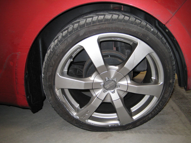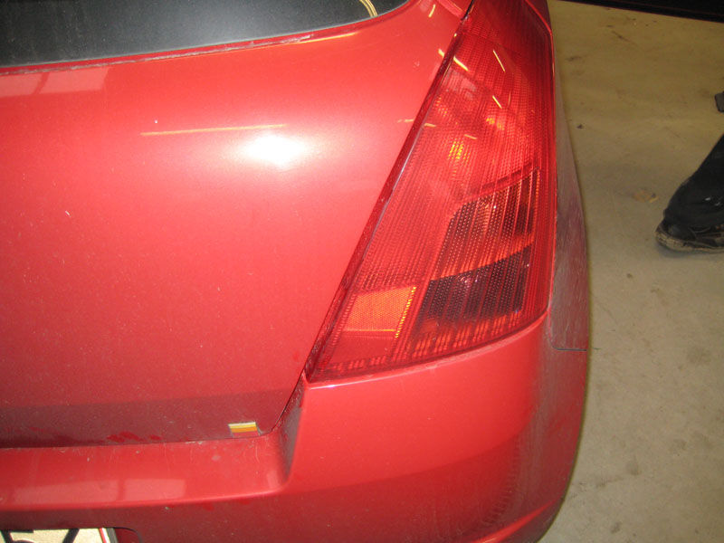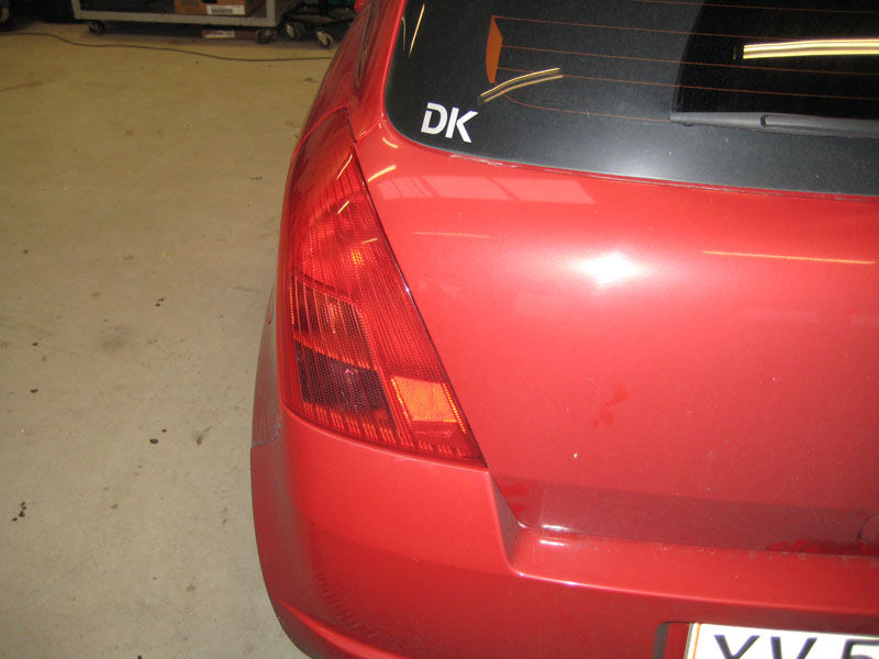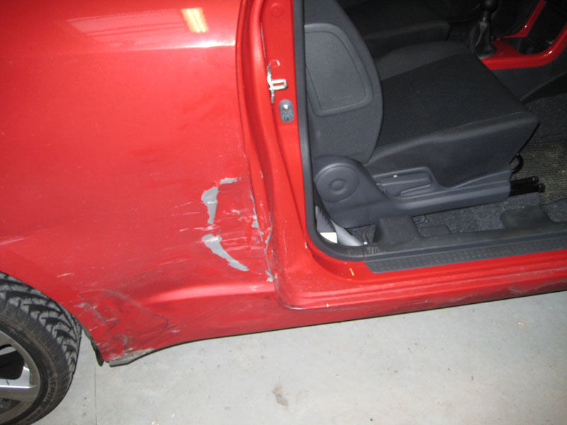 Klappen passer meget godt i denne side. Men ikke så godt i denne side. Man kunne stikke en pegefinger ind mellem lygten og bagklappen Resultatet af mødet mellem en OZ fælg og en kantsten. Fælg 0 - Kantsten 1 En trykket B-stolpe En lille advarsel. Lad være med at kantstensparkere med røven... Blev ramt i højre side, både dør og bagskærm