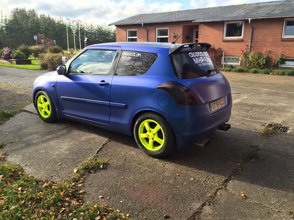 Beskrivelse: Hejsa her min swift jeg har malet med Plasti dip i World rally blue og neon gule vinter fælge